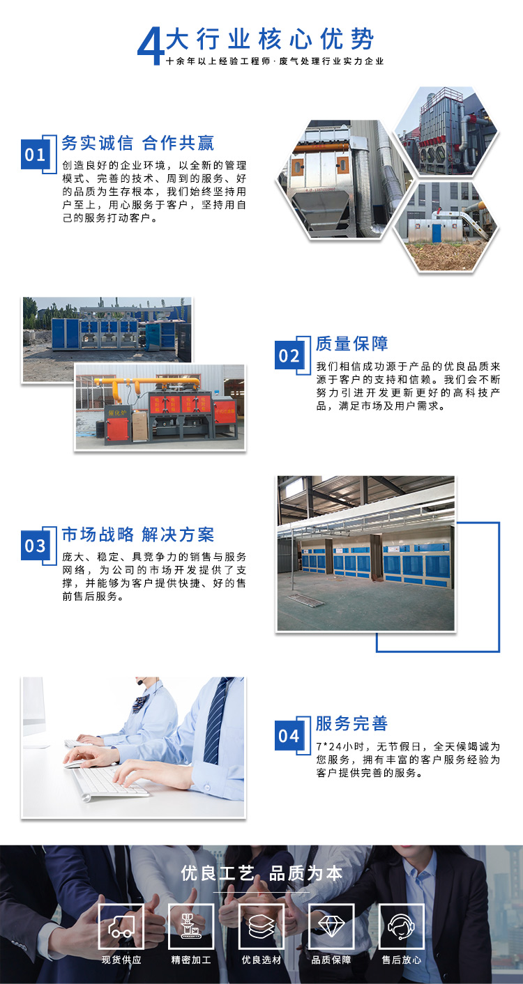 公司以其獨特的技術和專業(yè)化、成套化先進設備在行業(yè)內樹立了一面鮮明旗幟,打造出眾多技術含量高、質量過硬、效果優(yōu)異的示范工程。設備廣泛適用于各類VOCs有機廢氣、橡膠及PVC廢氣凈化、噴涂廢氣凈化、機械加工、金屬加工、建材、酒店餐飲及醫(yī)院學校等公共事業(yè)區(qū)域的廢氣和油煙治理。
